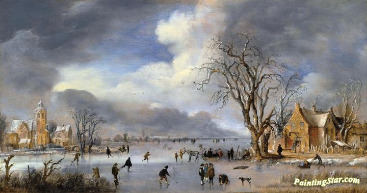 A winter landscape with skaters and kolf players on a frozen river, Art Painting by Aert van der Neer