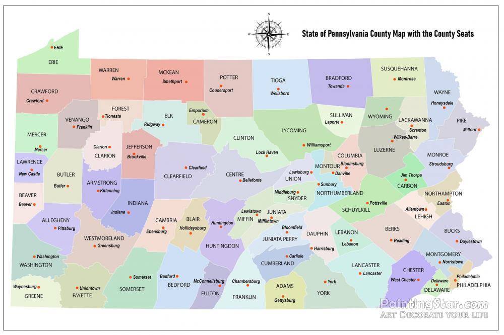 State Of Pennsylvania County Map With The County Seats, Art Painting by Collections