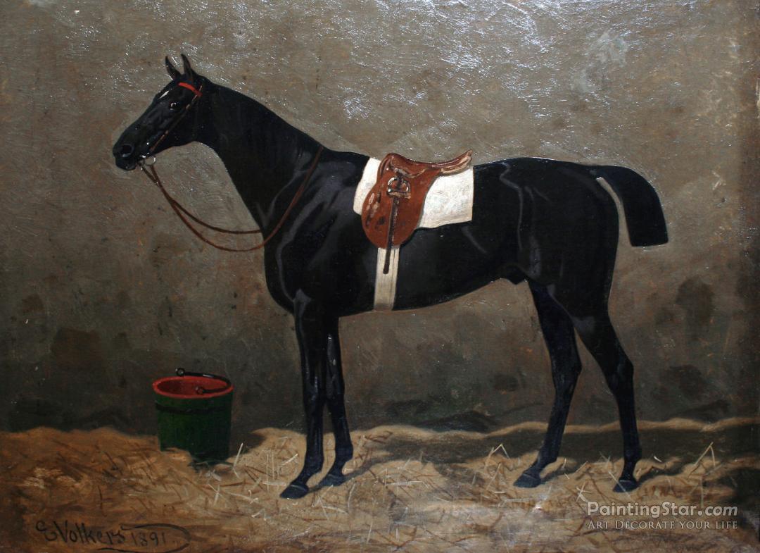 A Saddled Racehorse In A Stable, 1891, Art Painting by Emil Volkers