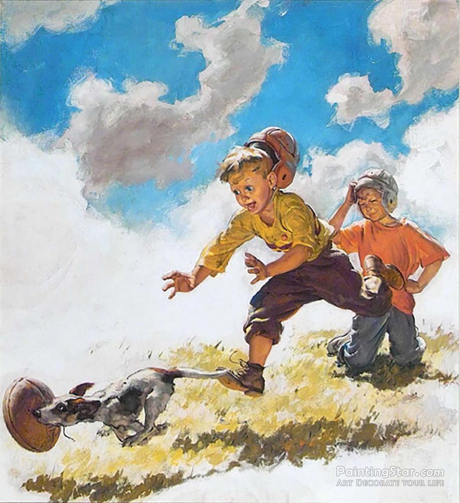 Boys In Football Helmets Running After A Dog, 1938, Art Painting by Harry Anderson