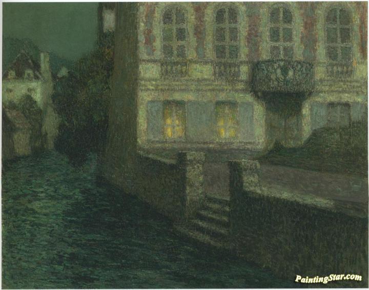 House by the River in full moon, Art Painting by Henri Le Sidaner