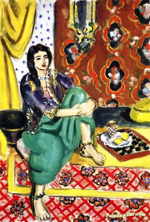 Seated Odalisque, Left Knee Bent, Ornamental And Checkered Background, Art Painting by Henri Matisse