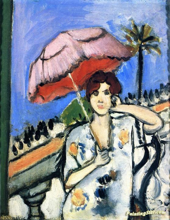 Woman on a Balcony with a Pink Umbrella, Face on, Half Figure, Art Painting by Henri Matisse