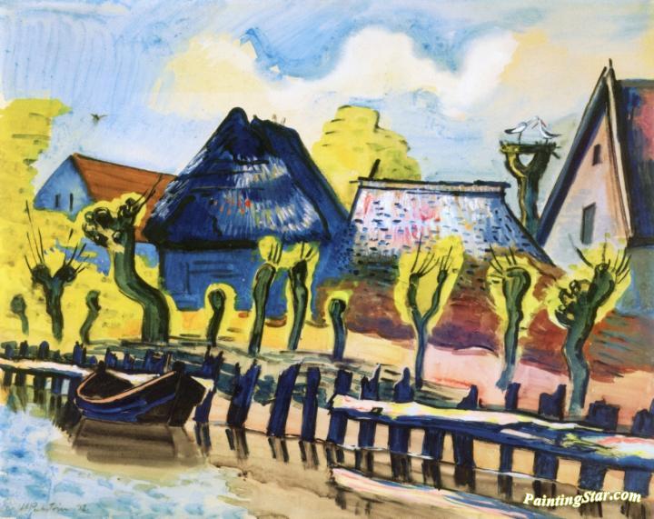 Fishing Village with Stork's Nest, Art Painting by Hermann Max Pechstein