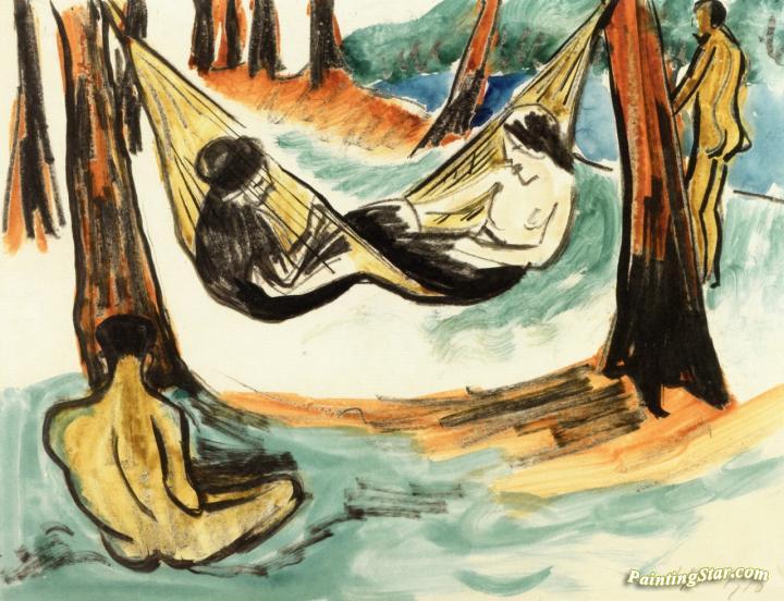 Two Girls In The Hammock Vii (with Seated Male Nude), Art Painting by Hermann Max Pechstein