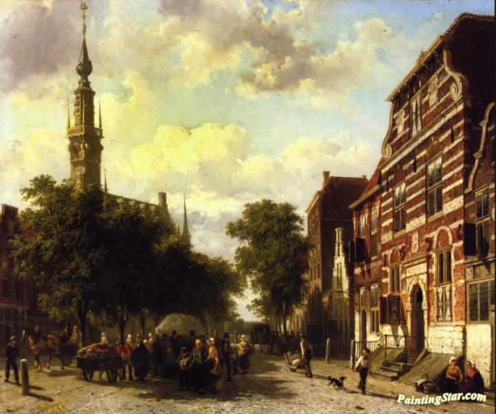 A Busy Market in Veere with the Clocktower of the Town Hall Beyond, Art Painting by Cornelius Springer