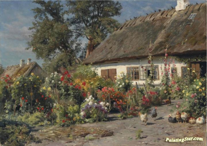 A Cottage Garden with Chickens, Art Painting by Peder Mork Monsted