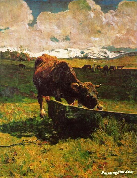 A cow drinking water, Art Painting by Giovanni Segantini