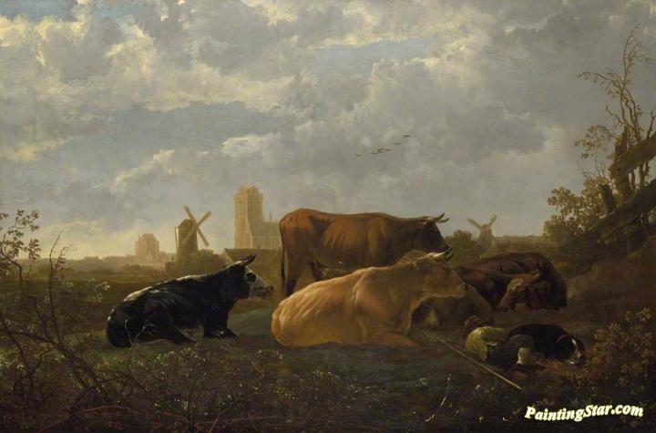 A Distant View of Dordrecht with a Sleeping Herdsman and Five Cows, Art Painting by Aelbert Cuyp