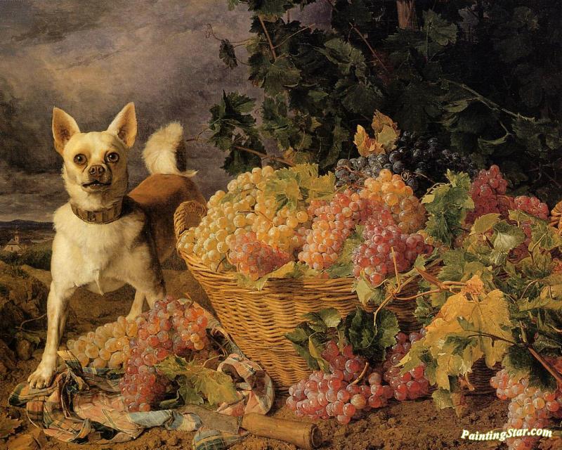 A Dog By A Basket Of Grapes In A Landscape, Art Painting by Ferdinand Georg Waldmuller