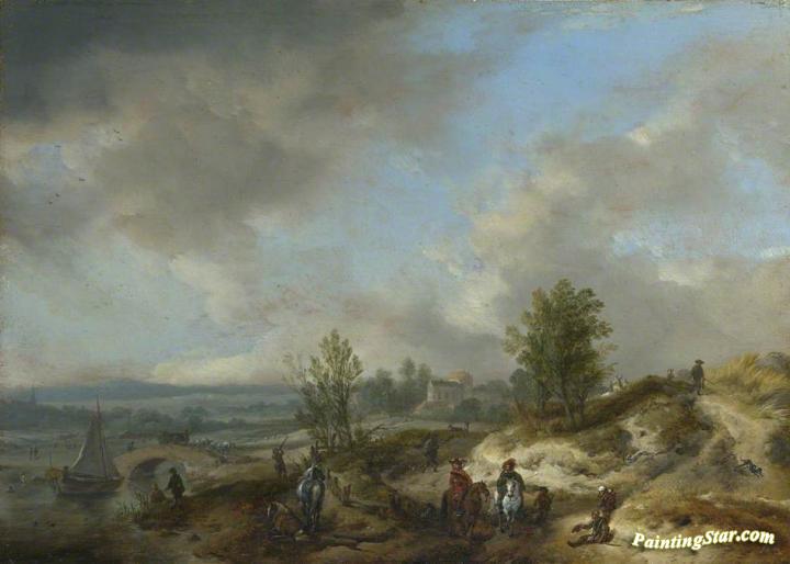 A Dune Landscape with a River and Many Figures, Art Painting by Philips Wouwermans