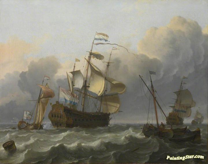 A Dutch Flagship with a Yacht Under Her Stern, Art Painting by Ludolf Bakhuizen