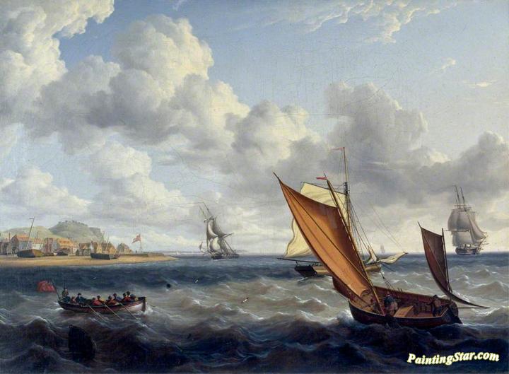 A Fishing Lugger and Customs Boat off a Coastal Town, Art Painting by Charles Martin Powell