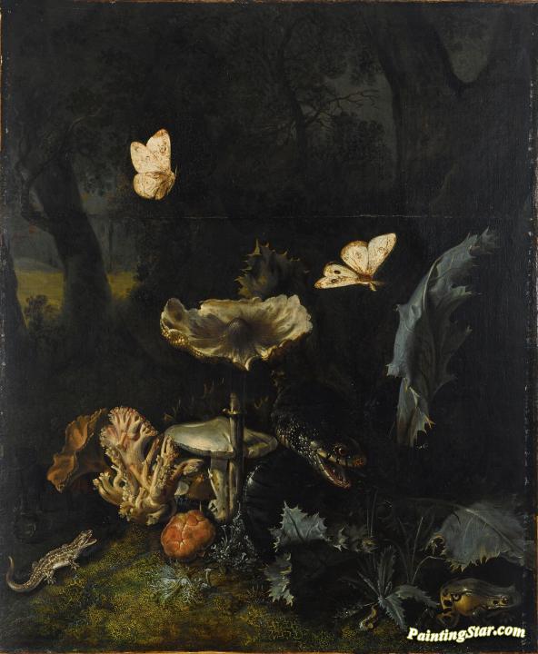 A Forest Floor Still Life with Various fungi, Thistles, an Aspic Viper, etc., Art Painting by Otto van Schrieck