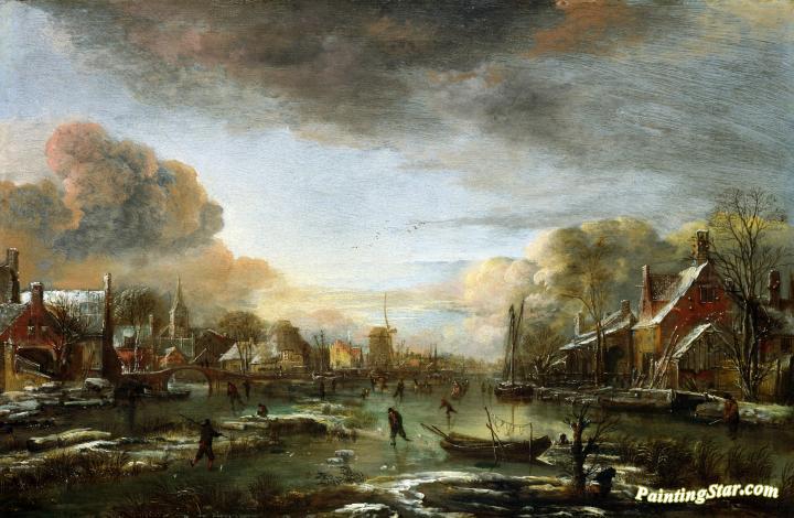 A Frozen River by a Town at Evening, Art Painting by Aert van der Neer