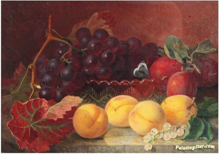 A glass disk of raspberries with a silver salver with peaches and white currants of a take, Art Painting by Eloise Harriet Stannard