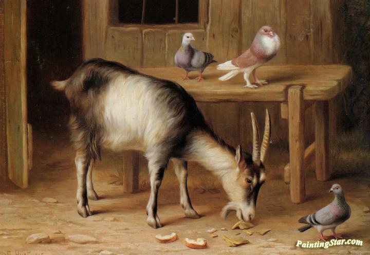 A Goat and Pigeons In a Farmyard, Art Painting by Edgar Hunt