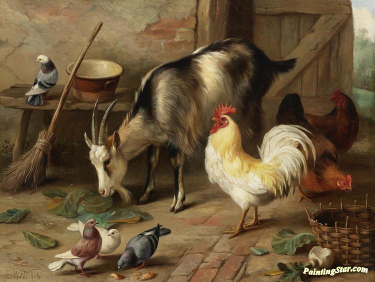 A Goat, Chicken And Doves In A Stable, Art Painting by Edgar Hunt