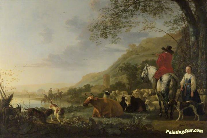 A Hilly Landscape with a Horseman Talking to a Shepherdess, Art Painting by Aelbert Cuyp