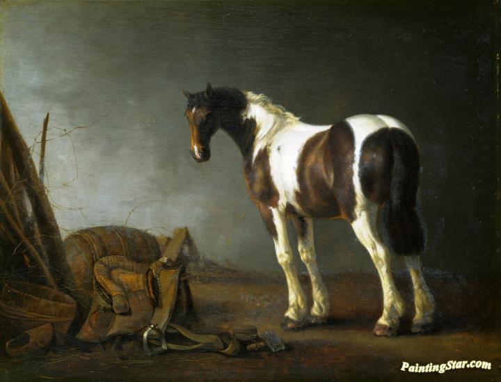 A Horse with a Saddle Beside it, Art Painting by Abraham van Calraet