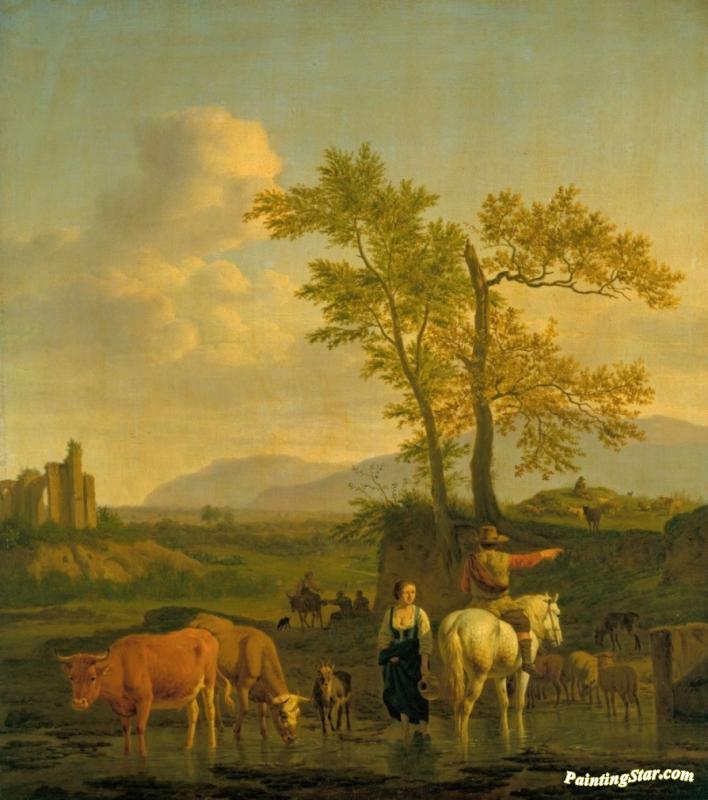 A Horseman At A Ford, Asking The Way Of A Herdswoman, In An Italianate Landscape, Art Painting by Adriaen van de Velde