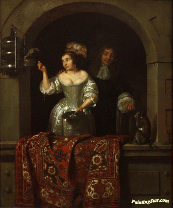A Lady With A Parrot And A Gentleman With A Monkey, Art Painting by Caspar Netscher