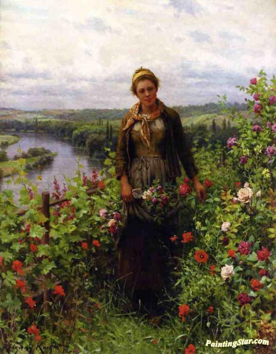 A Maid in Her Garden, Art Painting by Daniel Ridgway Knight