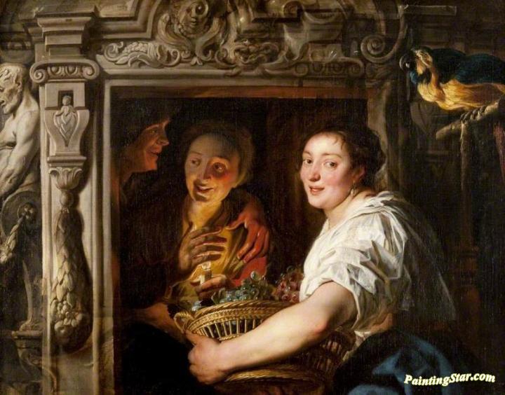 A Maidservant with a Basket of Fruit and Two Lovers, Art Painting by Jacob Jordaens