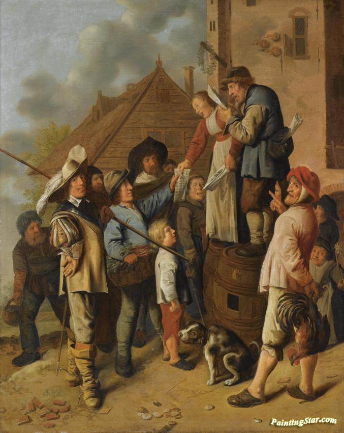 A Man And A Woman Standing On Barrels Reading A Newspaper Out Loud, Surrounded By A Group Of Figures, Outside A Tavern, Art Painting by Jan Miense Molenaer