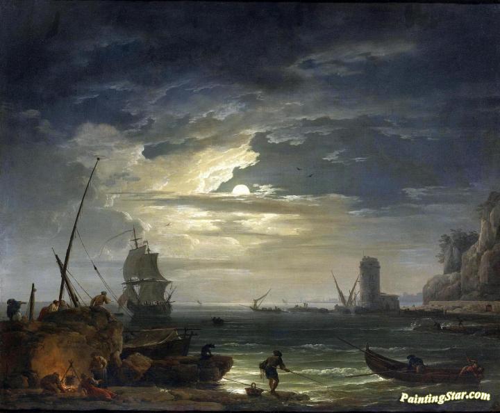 A Mediterranean Inlet By Moonlight, Art Painting by Claude-Joseph Vernet