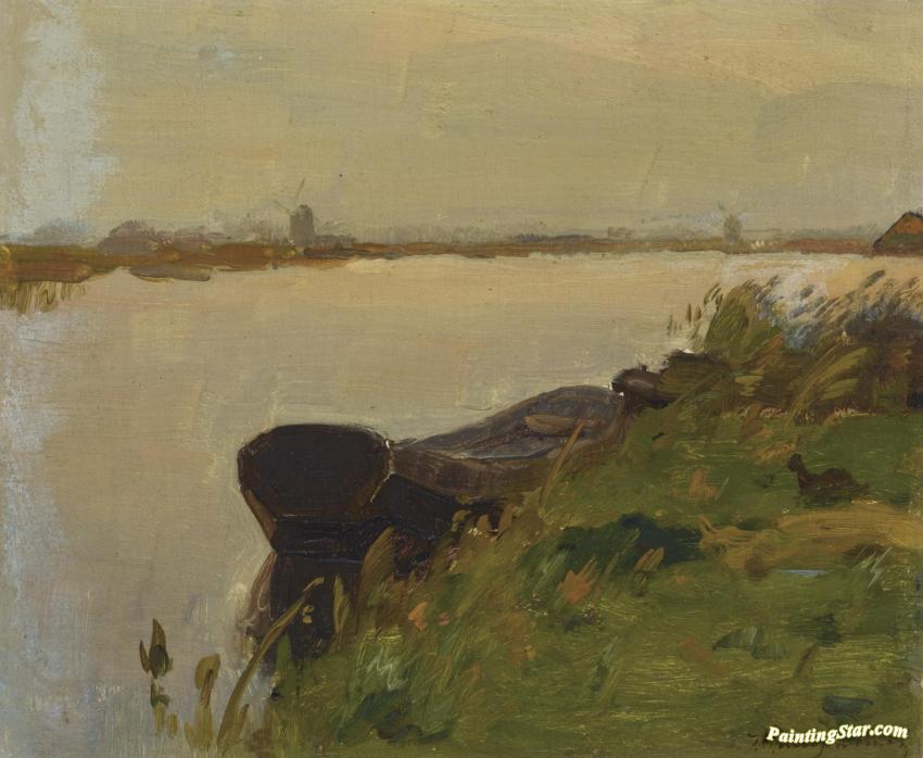 A Moored Boat In A Polder Landscape, Art Painting by Jan Weissenbruch