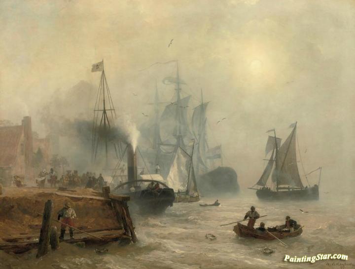 A Moored Steamer at a Busy Quay, Art Painting by Andreas Achenbach