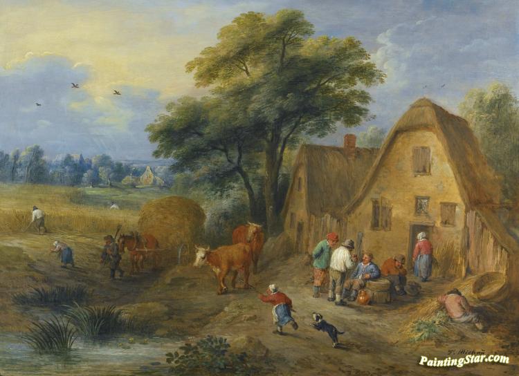 A Northern Landscape With Villagers Conversing And Harvesters Returning From The Fields,with A Farmer And A Dog Herding Two Cows, Art Painting by Théobald Michau