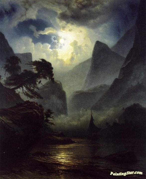 A Norwegian Fjord By Moonlight, Art Painting by Knud Andreassen Baade