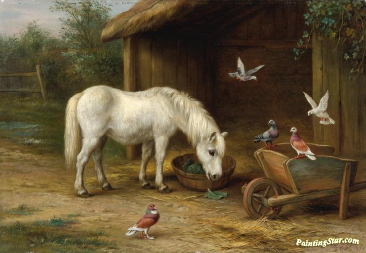 A Pony With Goats And Chickens In A Barn, Art Painting by Edgar Hunt