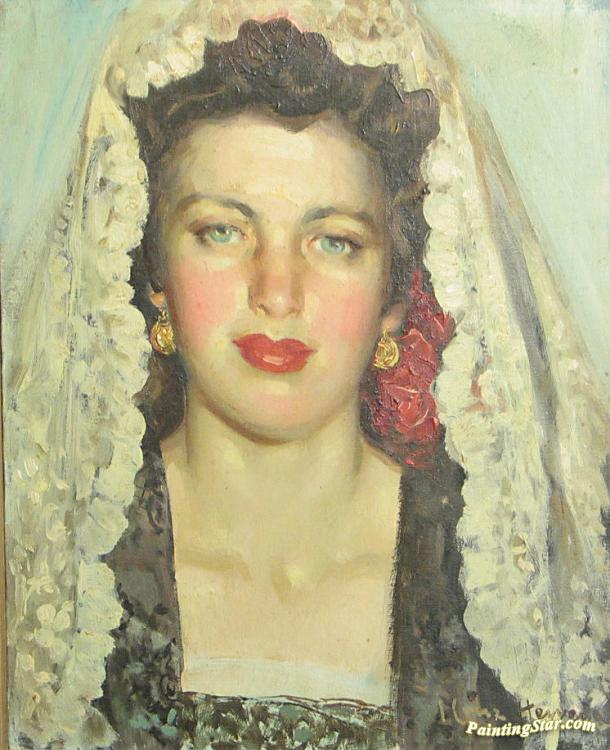 A Portrait Of A Young Woman In A Lace Mantilla, Art Painting by José Cruz Herrera