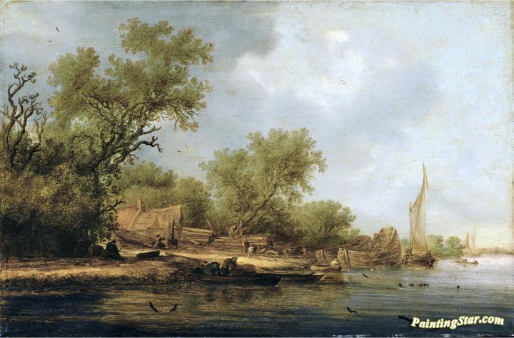 A River Landscape With Boatbuilders, Art Painting by Salomon van Ruysdael
