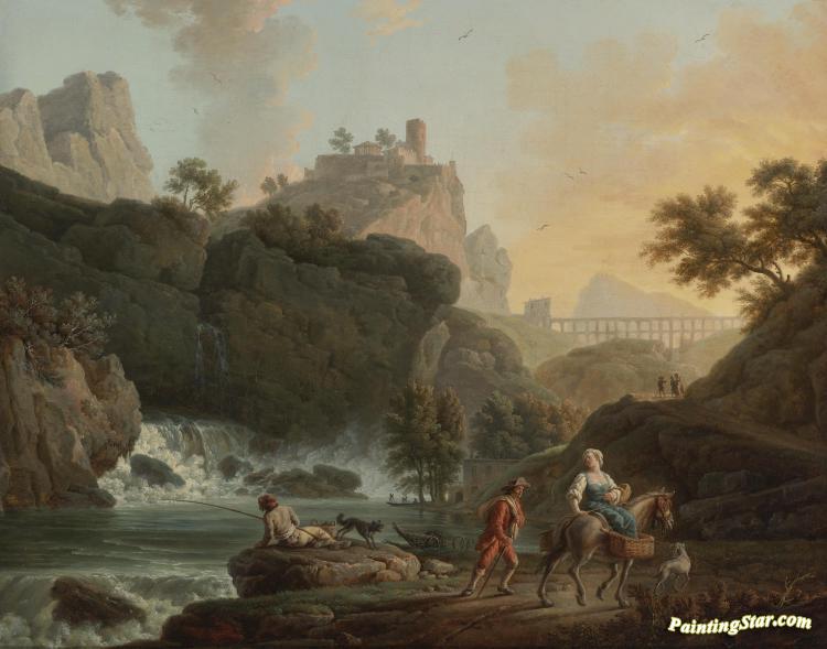 A Rocky Landscape With A Fisherman And Travellers By A River With A Waterfall, Art Painting by Claude-Joseph Vernet