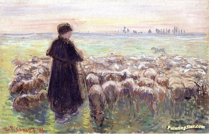 A Shepherd and His Flock of Sheep, Art Painting by Camille Pissarro