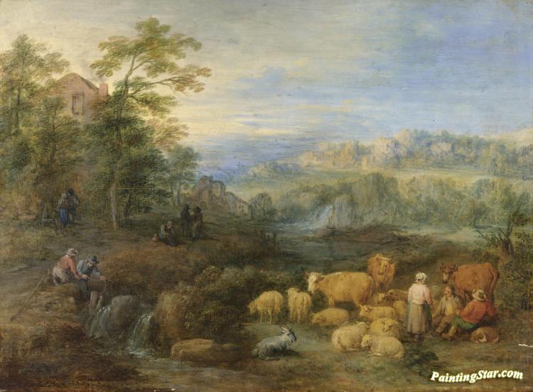 A Summer Landscape With Shepherds And Herdsmen Resting Their Sheep And Cattle By A Stream, Art Painting by Théobald Michau