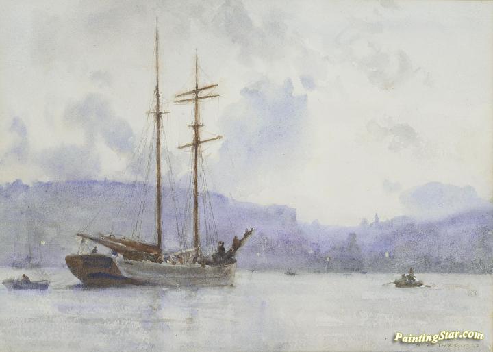 A topsail schooner off a port at dusk, Art Painting by Henry Scott Tuke