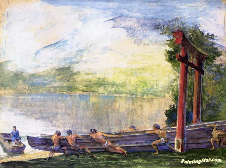 A Torii on Shore of Lake Chusenji, Japan. Fishermen Pushing Out Their Boat, Art Painting by John La Farge