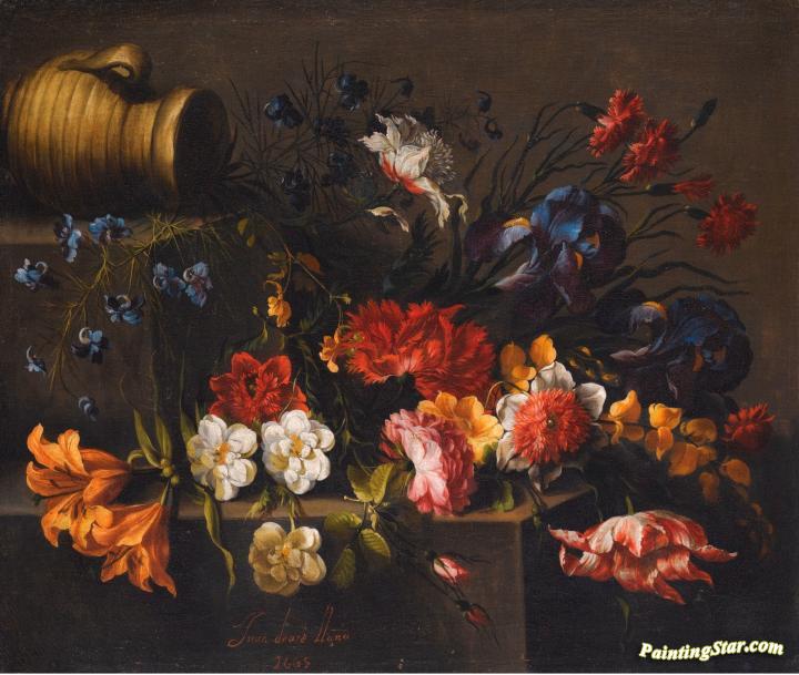 A Tulip, Roses, Dahlias, Peonies, Campanula, Orange Blossom on some Steps, Art Painting by Juan de Arellano