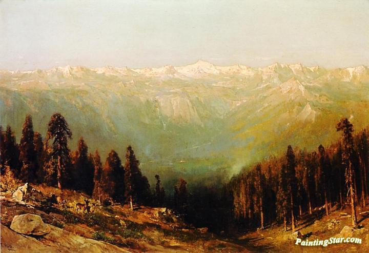 A View of the Hetch Hetchy Valley with Deer in the Foreground and Mount Conness in the Distance, Art Painting by Thomas Hill