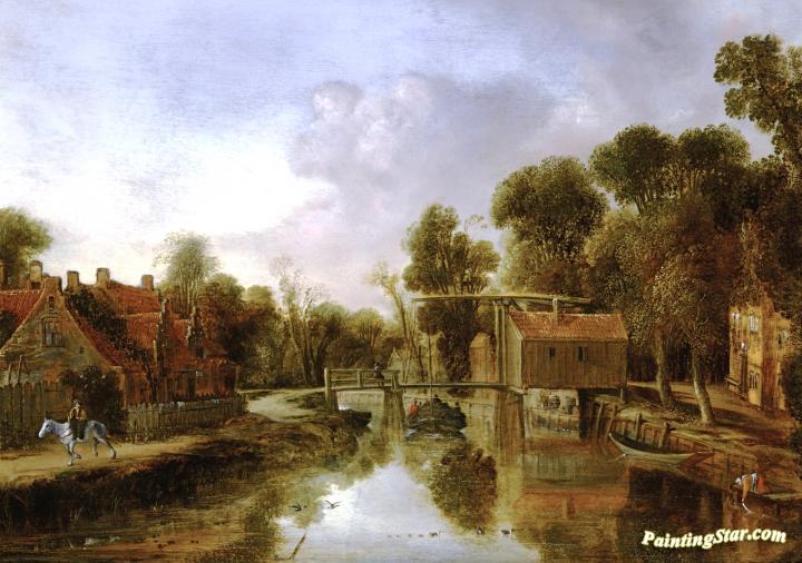 A village with a drawbridge over a river, etc., Art Painting by Aert van der Neer