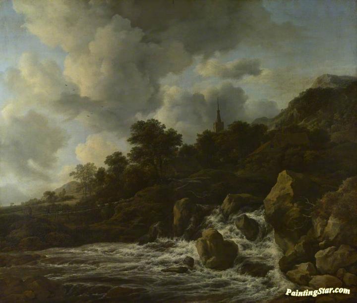 A Waterfall at the Foot of a Hill, near a Village, Art Painting by Jacob van Ruisdael
