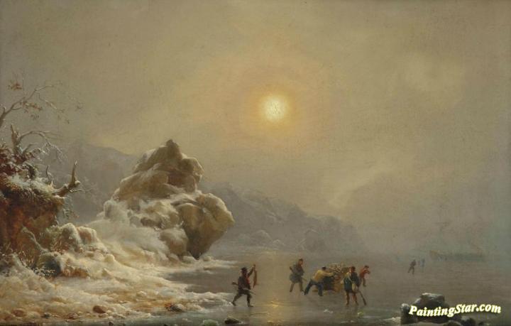 A Winter Landscape with Hunters on the Ice, Art Painting by Andreas Achenbach