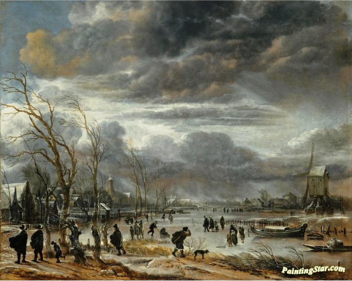 A winter lanscape with figures battling across a frozen river, Art Painting by Aert van der Neer