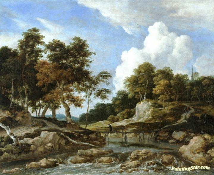 A Wooded River Landscape With A Bridge, A Church Beyond, Art Painting by Jacob van Ruisdael