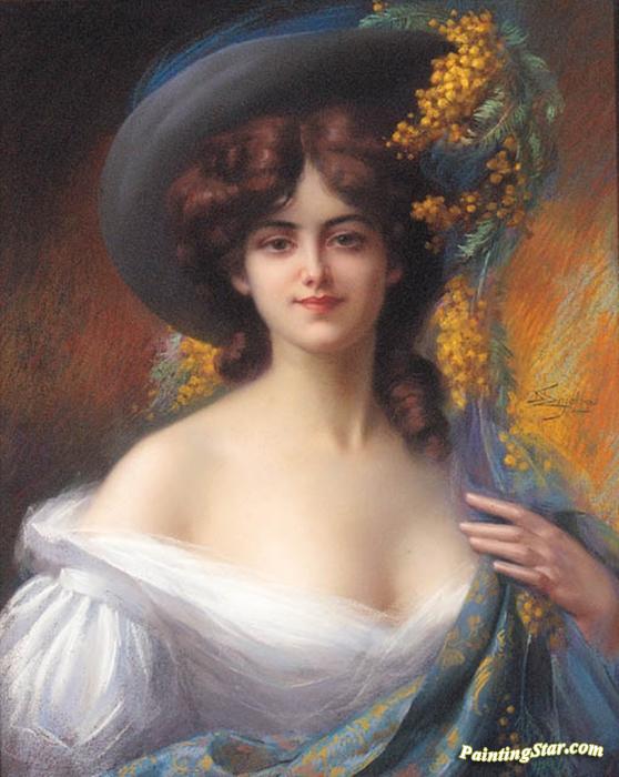 A Young Beauty In A Hat Decorated With Yellow Flowers, Art Painting by Delphin Enjolras